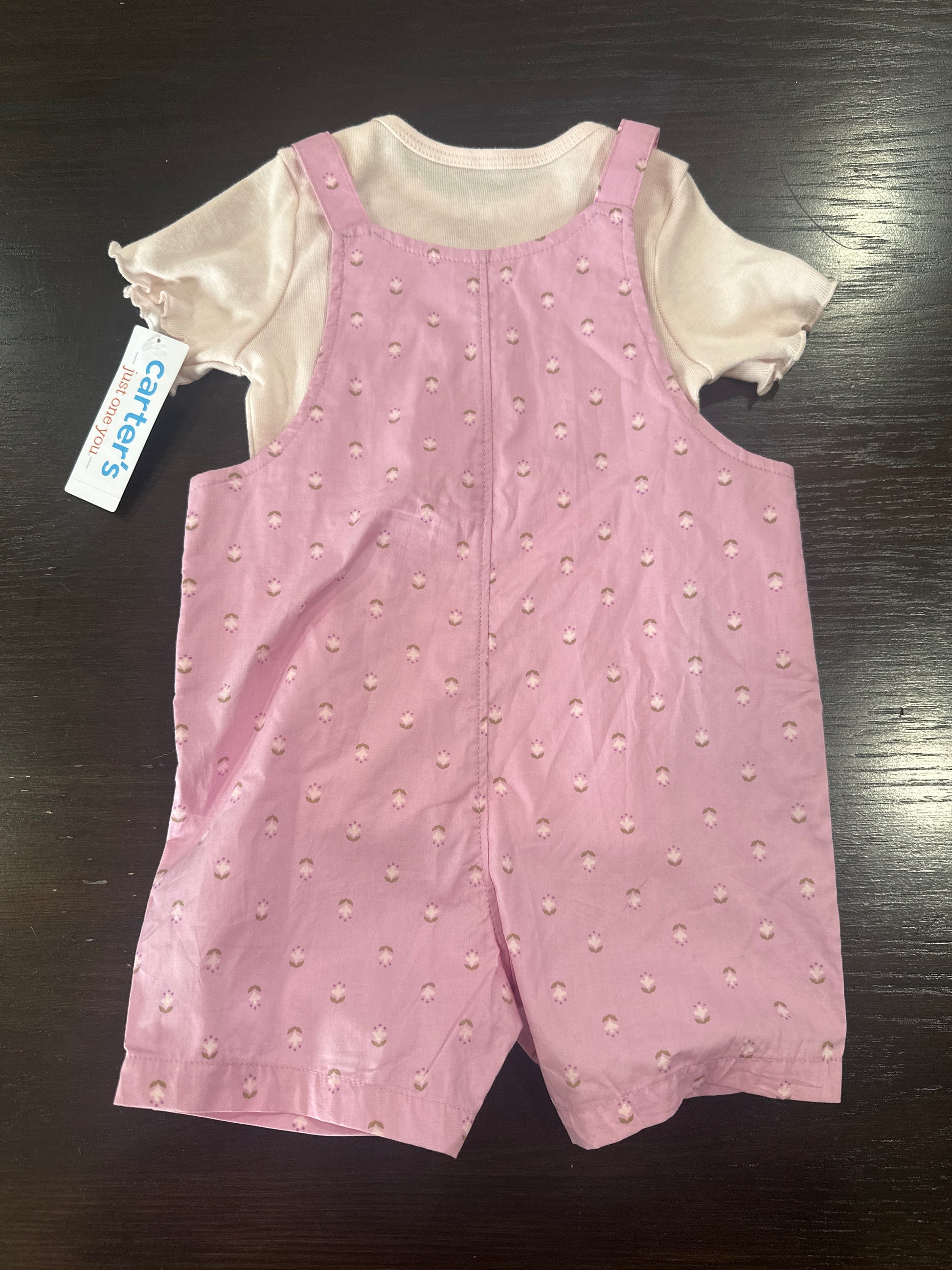 Dress your little one in effortless charm with this adorable Carter’s two-piece romper set. Featuring a soft short-sleeve tee layered under a sweet pink printed overall-style romper, this outfit is perfect for everyday comfort with a cute, classic look.