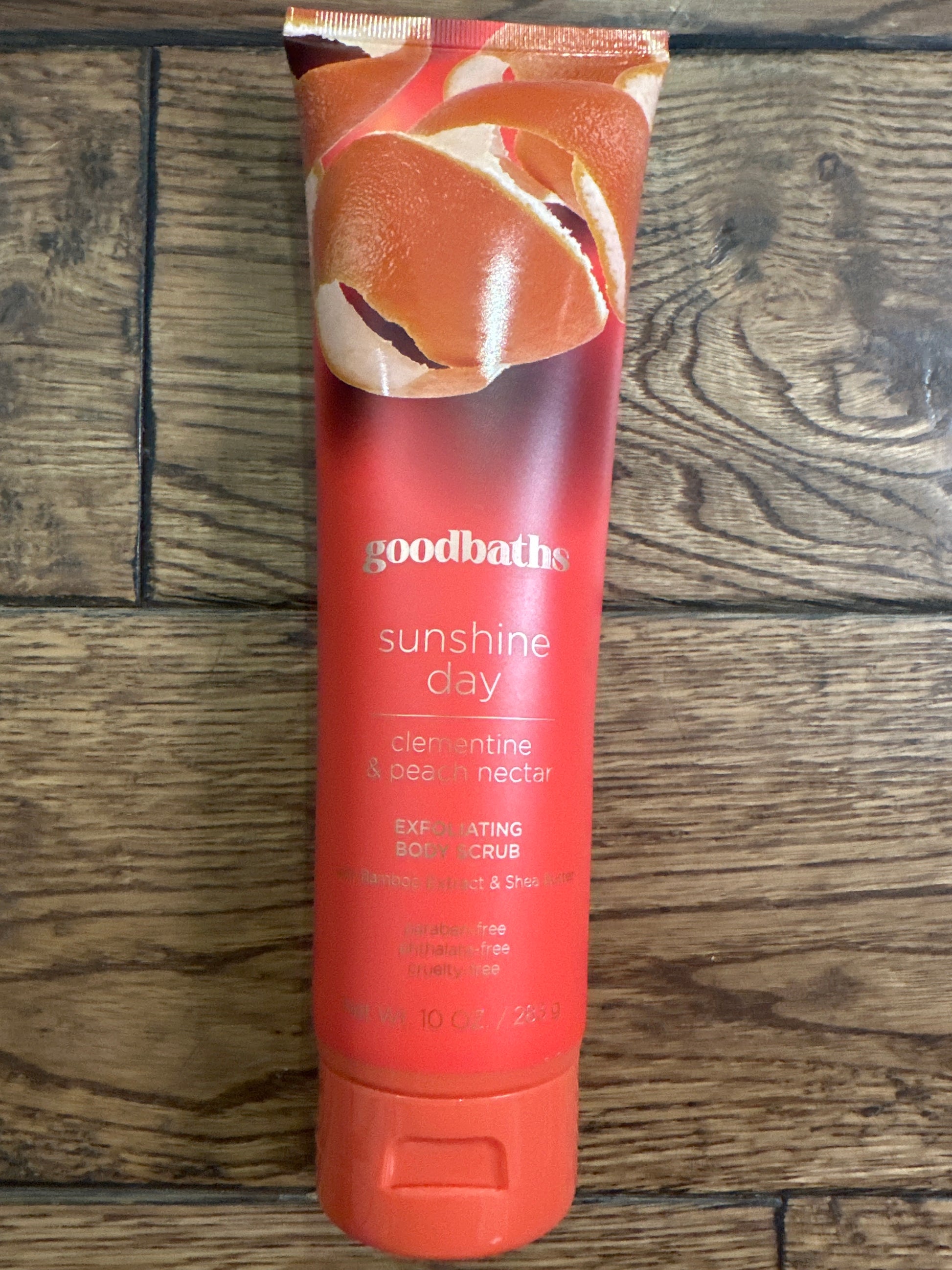 GoodBaths Sunshine day Body Scrub has a scent of Clementine and peach nectar.