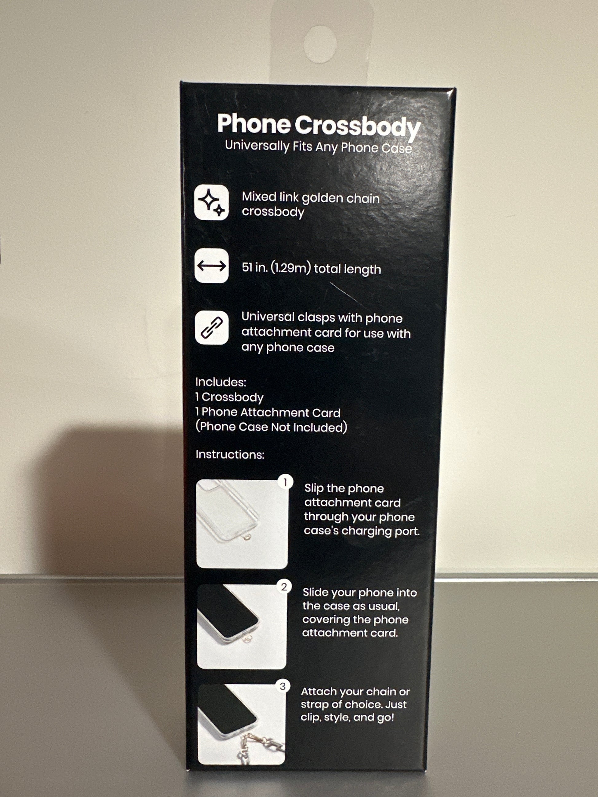 • Clip crossbody chain to attachment card and go
