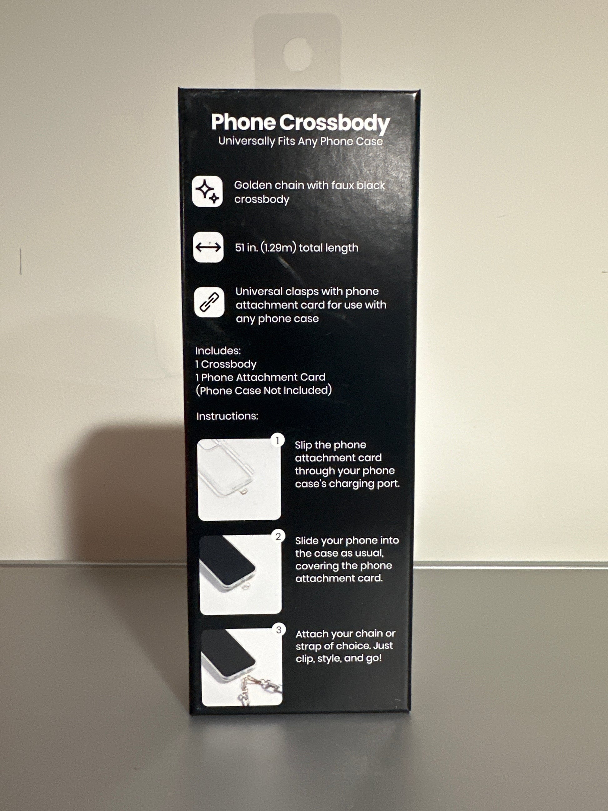 Carry your phone in effortless style with this Hello Lux phone crossbody strap featuring a sleek golden chain woven with black faux leather. Designed for hands-free convenience, this strap adds a bold, modern touch while keeping your phone secure and easily accessible throughout the day.