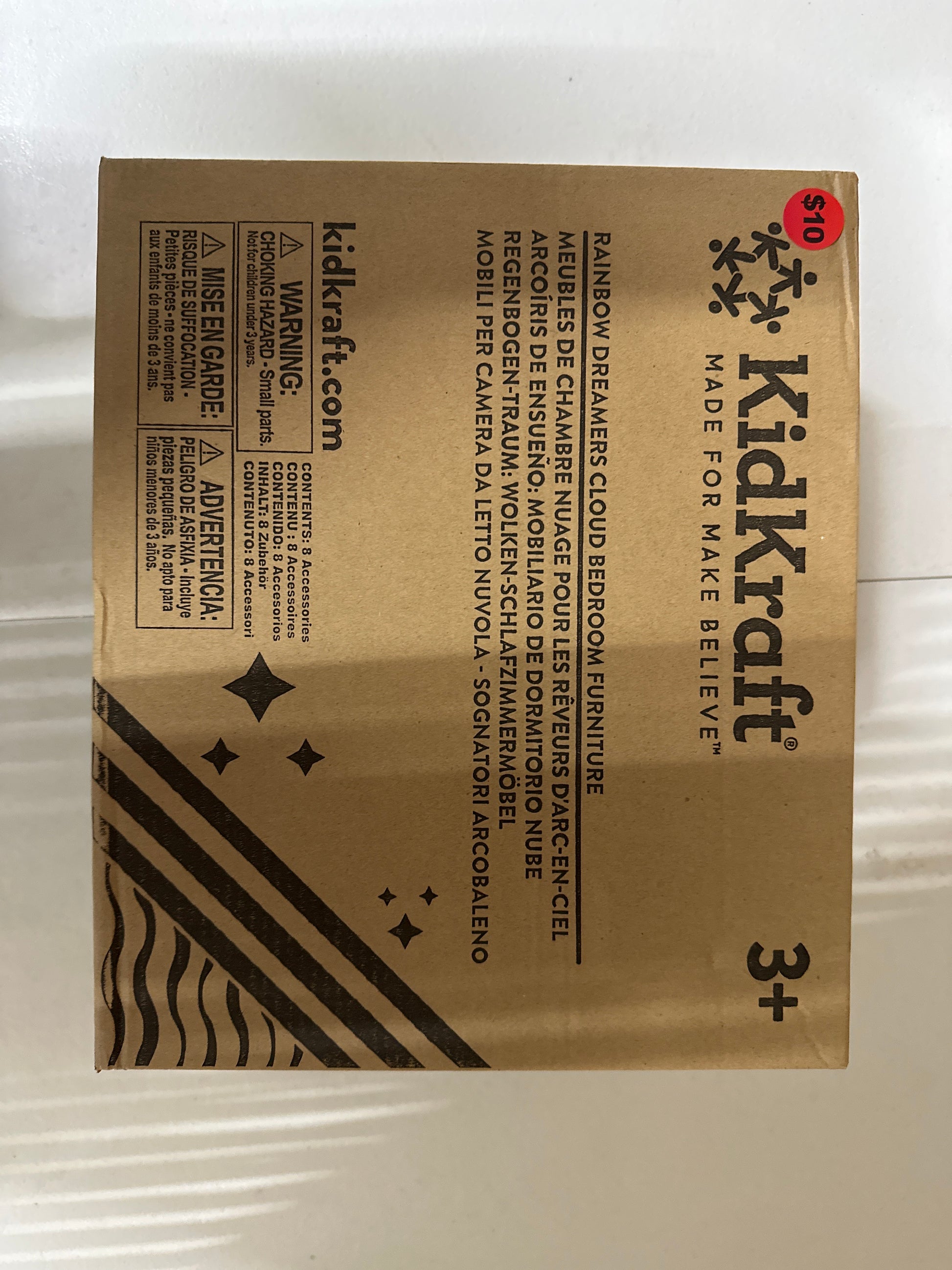 Sleep and dream like a princess in this exquisite bed with unicorn crown canopy. The KidKraft Rainbow Dreamers Cloud Bedroom Furniture is colorful, cozy and versatile. The bed can stay shorter for smaller dolls and figurines or stretch out to fit up to a 12" fashion doll. The fabric canopy gives the bed a regal look. Have a sleepover with your favorite magical friend. A Teddicorn figure and pet bed is included! Rainbow Dreamers Cloud Bedroom Furniture adds an elegant touch to any dollhouse.