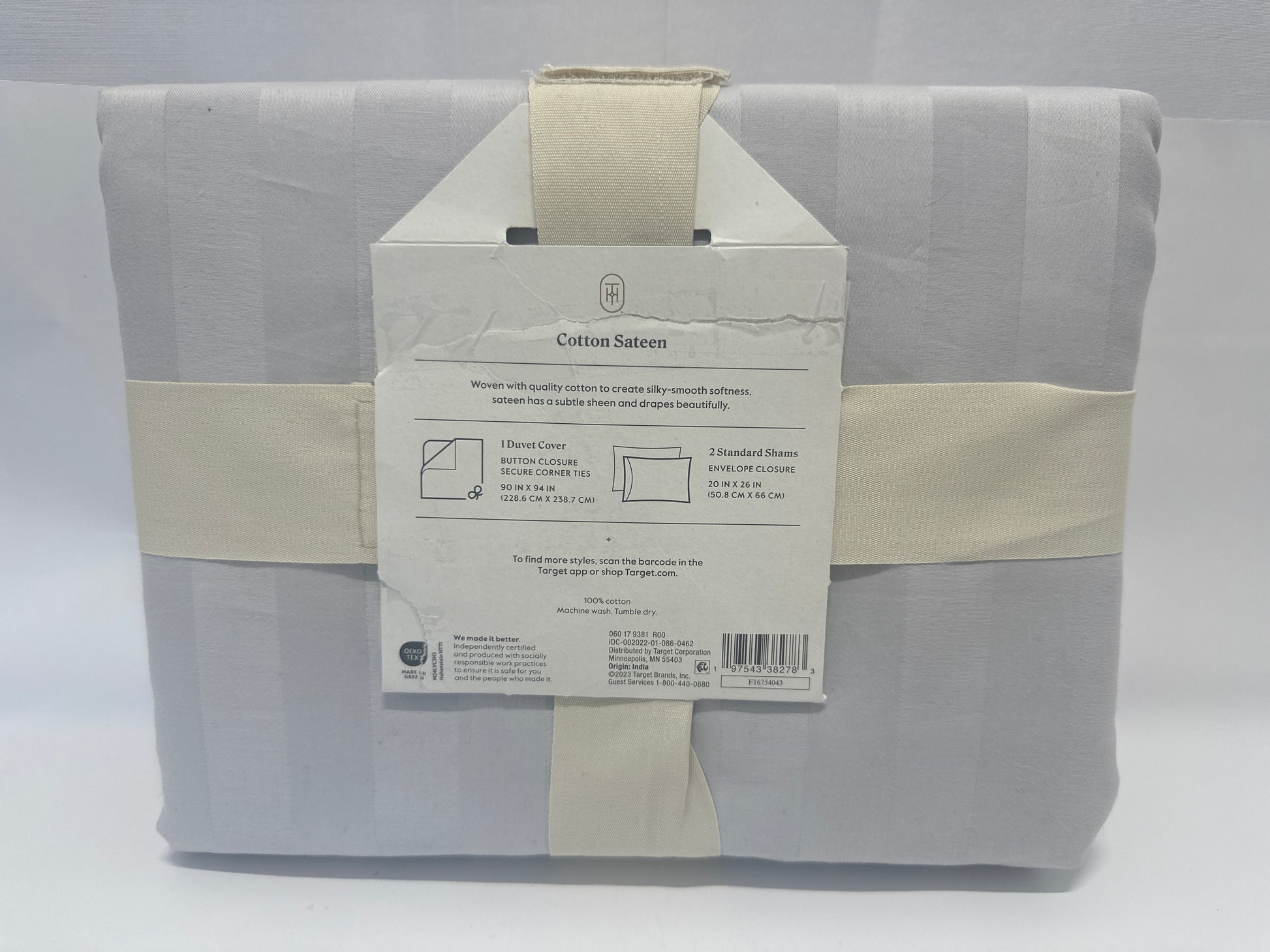 Upgrade your bedroom with this elegant duvet cover set from Threshold, crafted from smooth cotton sateen for a soft, hotel-inspired feel. The subtle stripe damask weave adds texture and sophistication while delivering breathable comfort for everyday use.