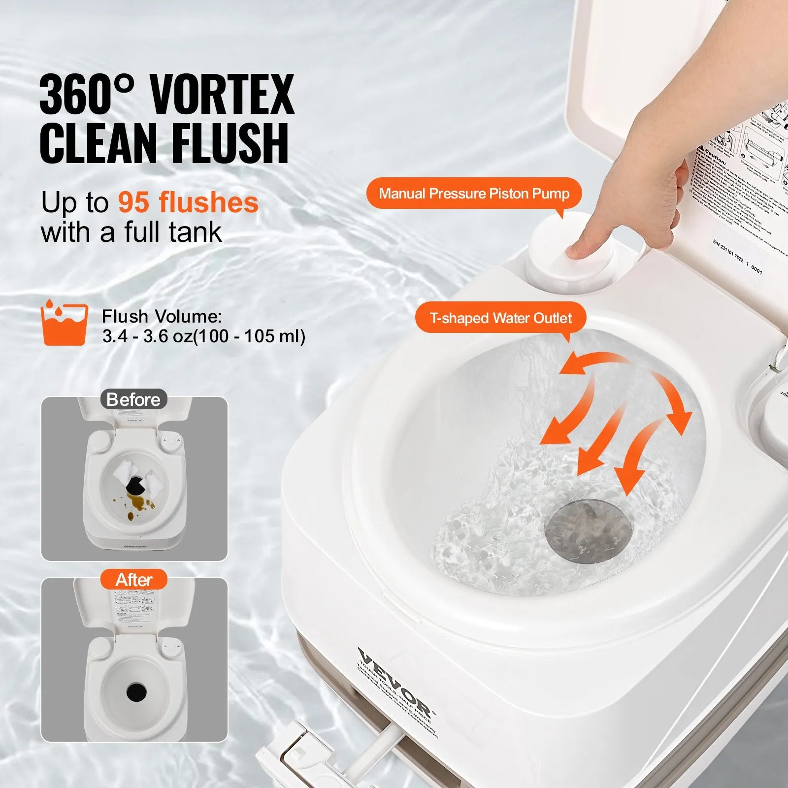 - Pressurized Flush up to 95 Times: The travel toilet features a 2.6 gal (10 L) flush tank with a manual piston pump for a pressurized flush, using 3.4-3.6 oz (100-105 ml) per flush for quick and efficient waste cleaning. The T-type full-coverage water outlet design ensures 360° rapid cleaning for a cleaner experience.