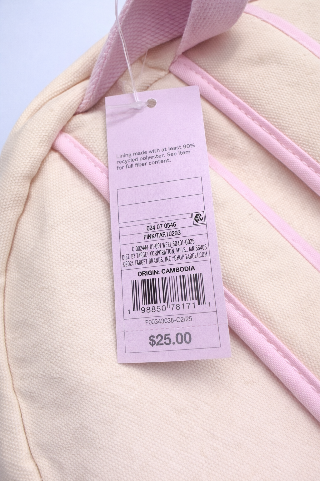 • Durable canvas backpack with soft pastel pink trim