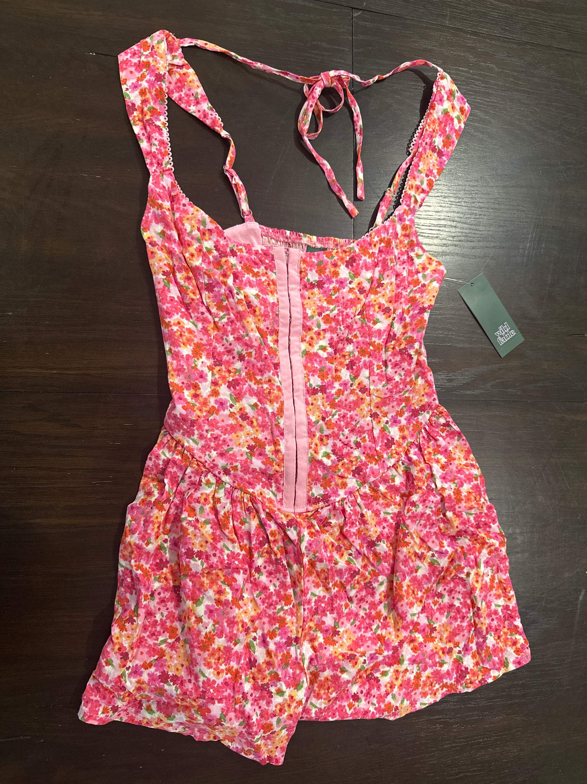Turn heads with this Women’s Hook and Eye Romper from Wild Fable™, designed with a flattering fitted bodice and flowy shorts for the perfect mix of playful and feminine style. Featuring a vibrant floral print and statement details, it’s an easy choice for warm-weather outings.